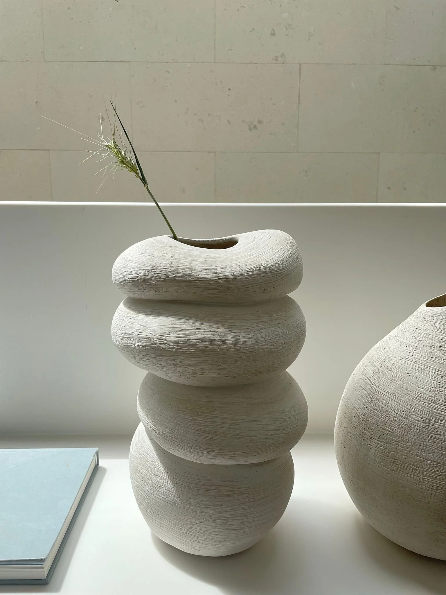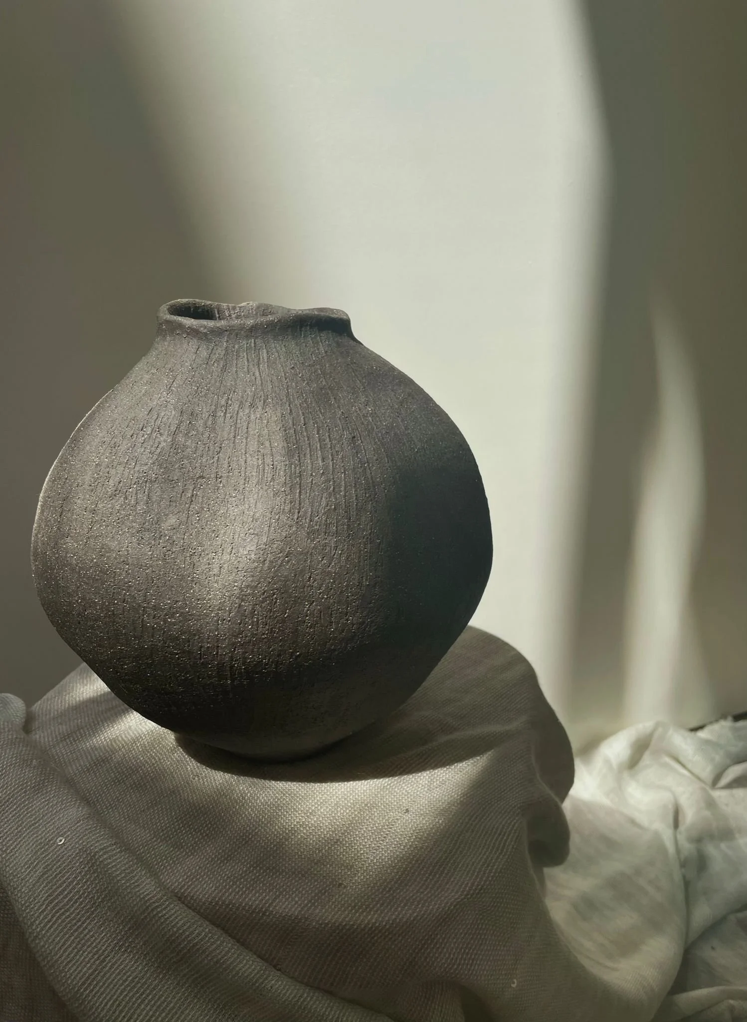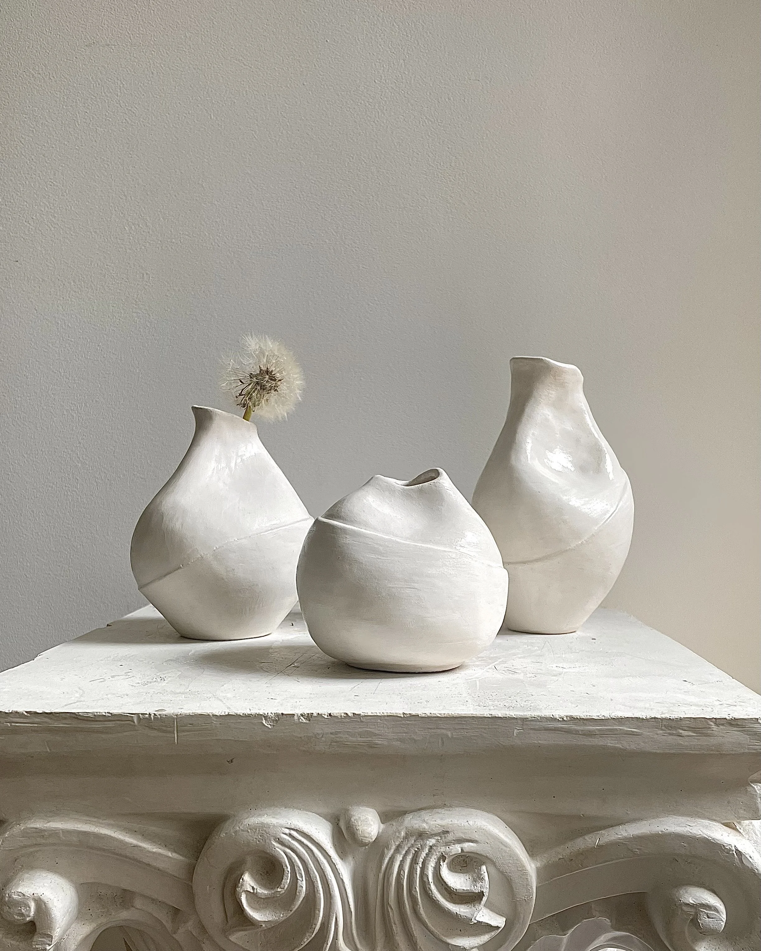 I primarily use my hands to mold my creations, occasionally enlisting wooden tools to subtly texture and detail each piece. The result is simplicity infused with elegance, a testament to organic beauty. My vases are glazed within, ensuring both beauty and function, while some bear a beeswax finish, a unique touch that imbues them with a muted, natural sheen.